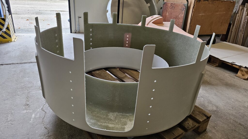 Unsere GFK-Abteilung realisiert Teile diverser Geometrien und Komplexitäten. Klassische Bauteile sind z.B. Luftleitschilde / Airguides. Hierzu haben wir bereits mehrteile, segmentierte Ringe hergestellt und mit hoher Passgenauigkeit zusammengesetzt. Zudem fertigen wir regelmäßig Gehäuse, Verkleidungen und andere Freiformkörper für den Maschinenbau.